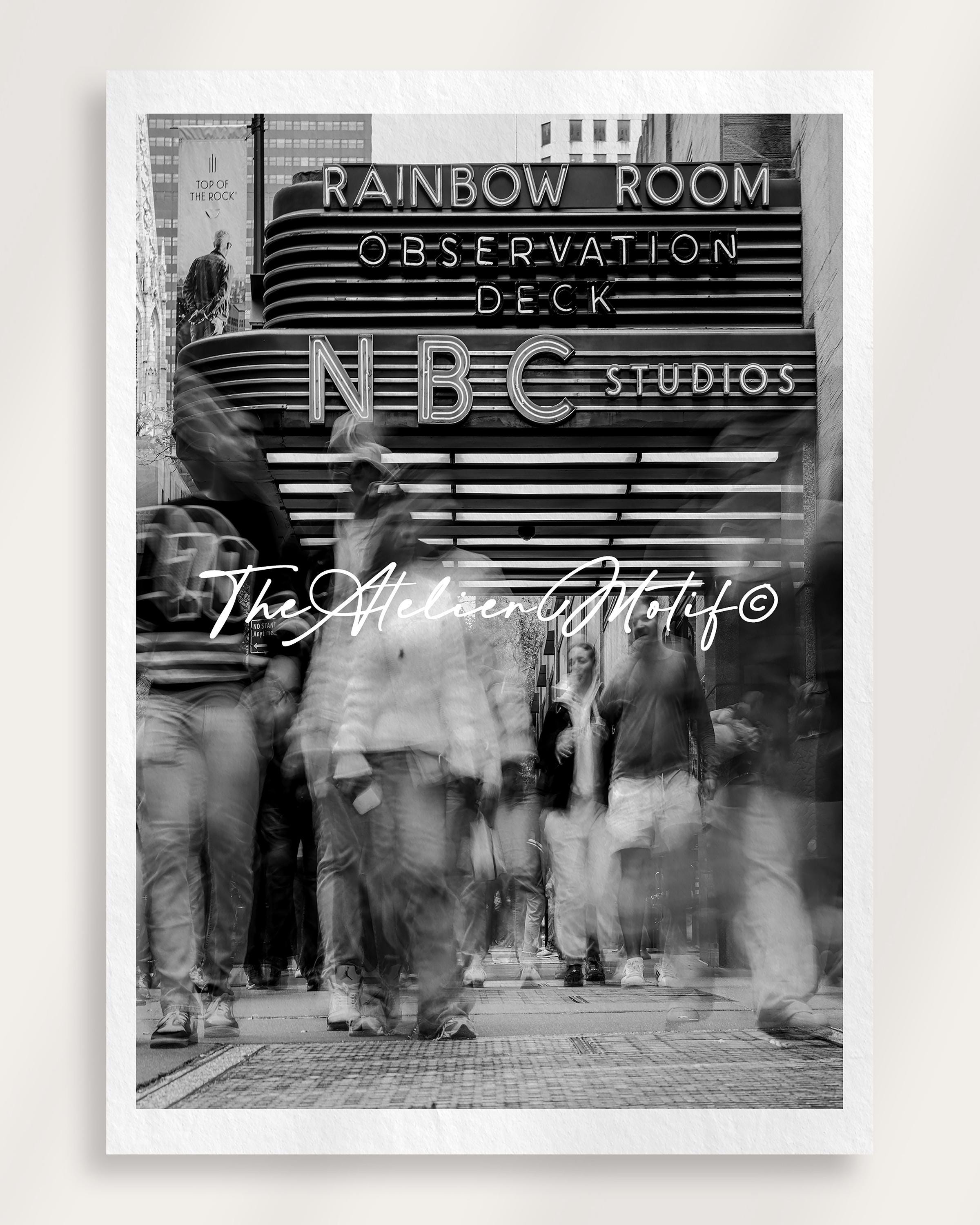 A cinematic black-and-white street photograph capturing the pulse of New York City in front of the legendary NBC Studios at Rockefeller Center. The long-exposure technique turns motion into a soft, ghostlike rhythm — a poetic balance between movement and stillness.