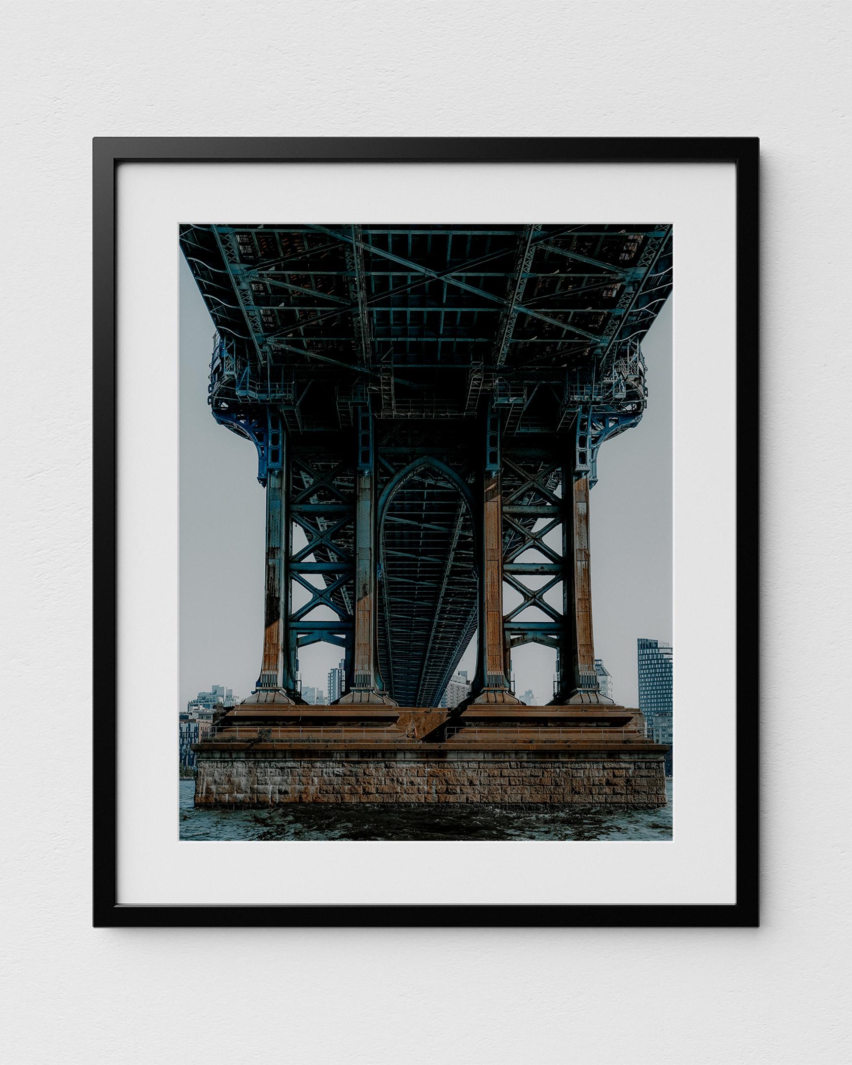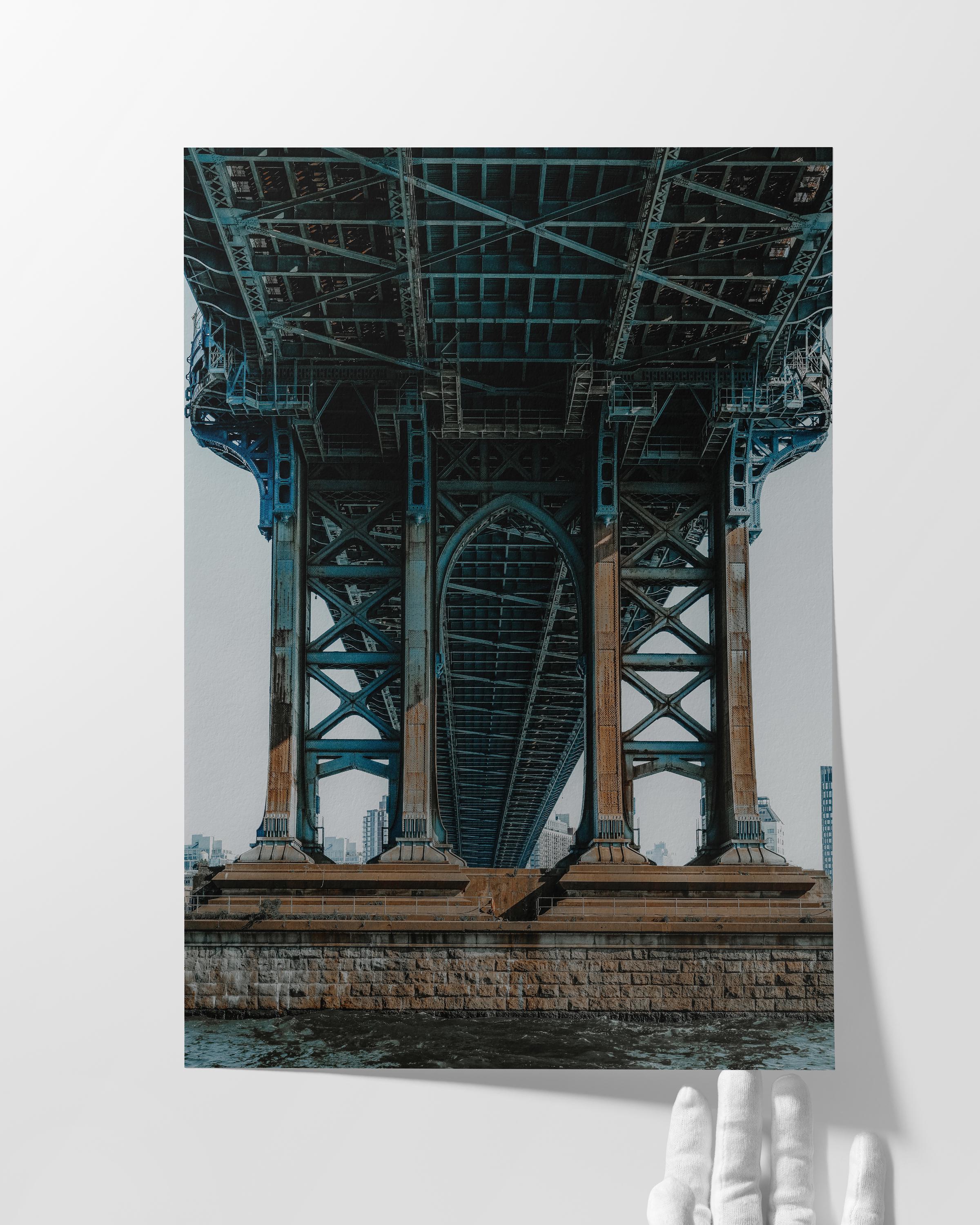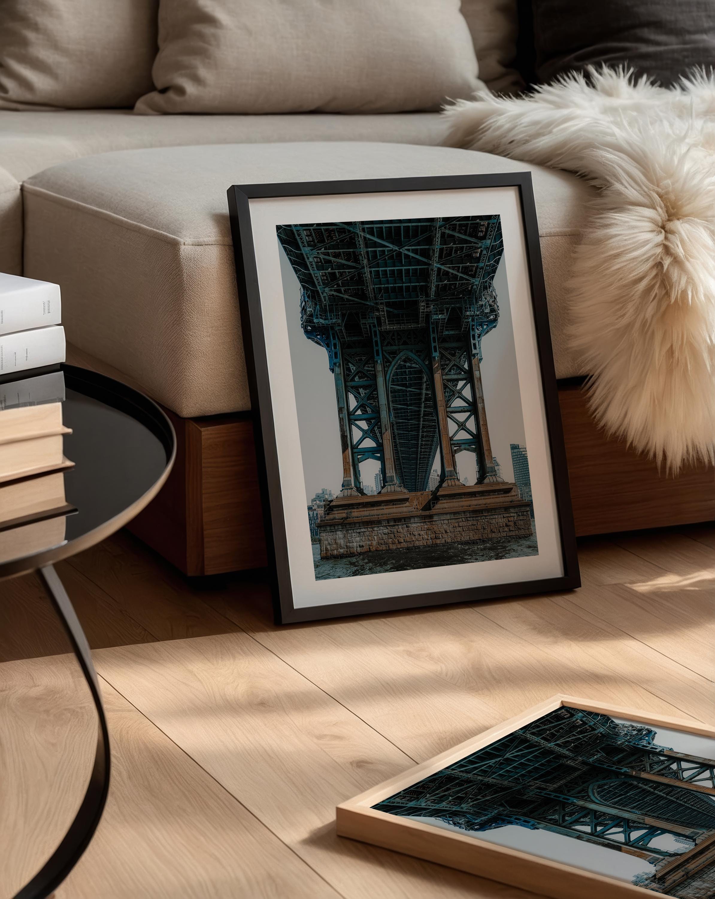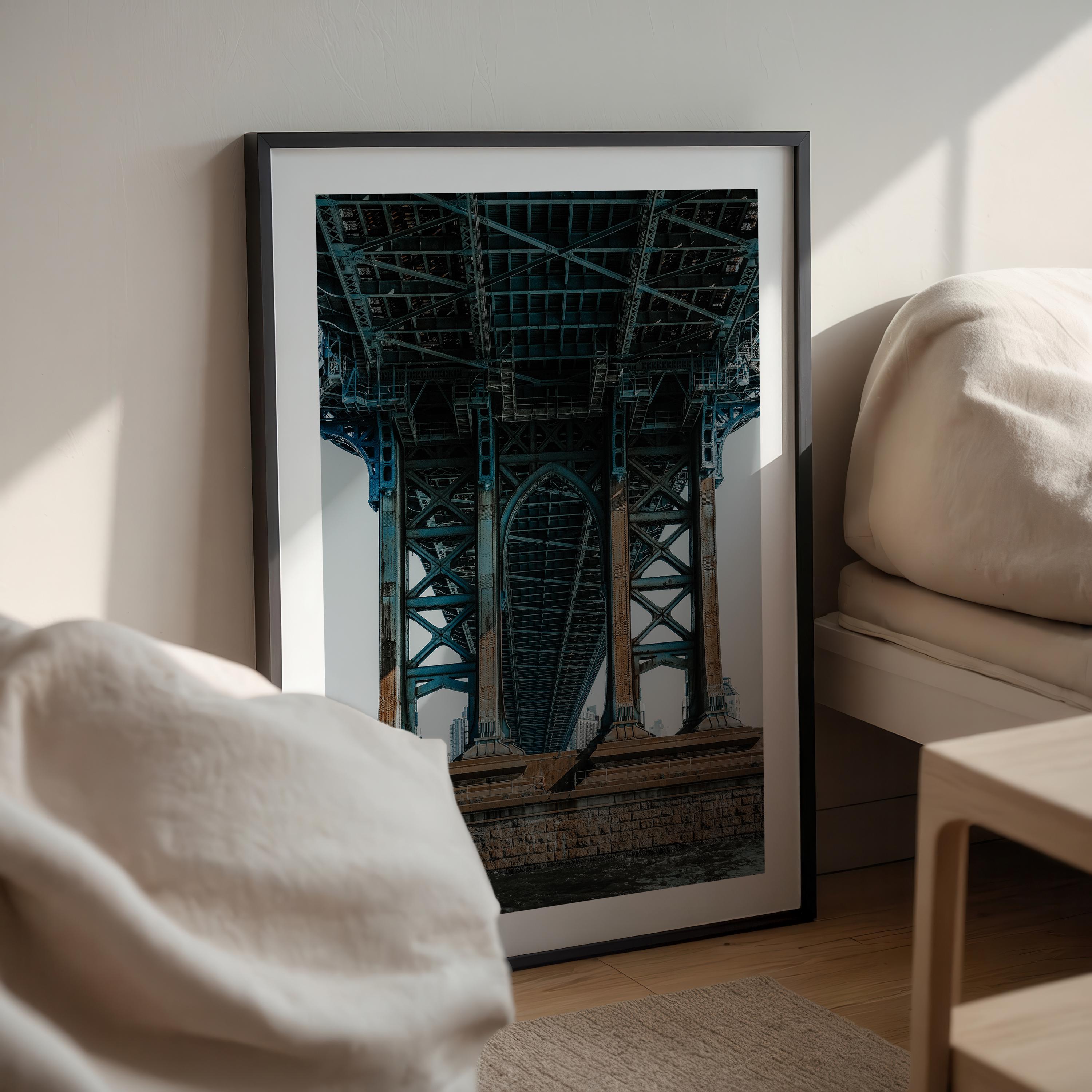 Transform your space with iconic New York architecture. Discover the raw, cinematic beauty of New York in this fine-art photograph of the Manhattan Bridge from a dramatic underpass perspective. The rich teal steel, rust accents, and bold urban geometry create a striking visual statement.