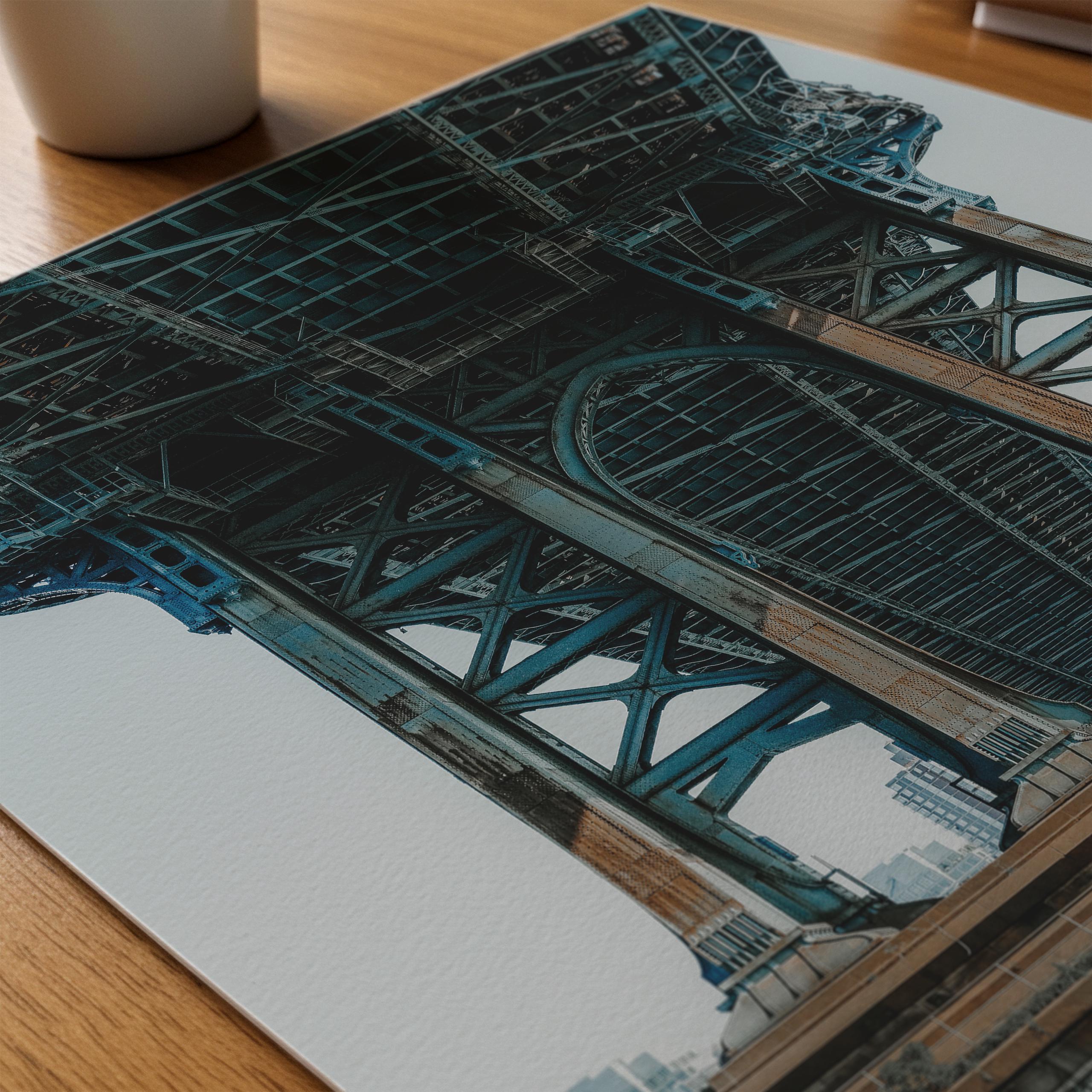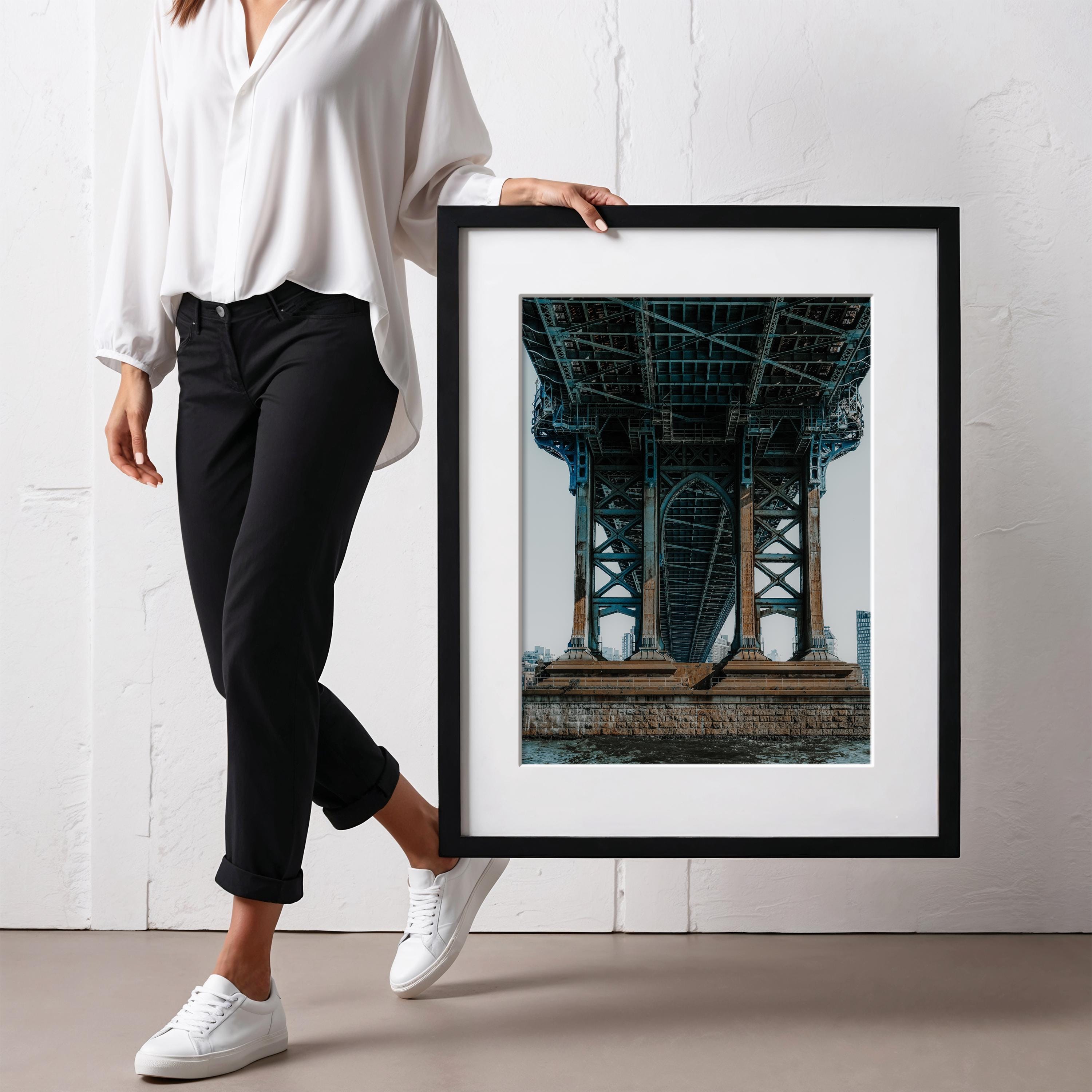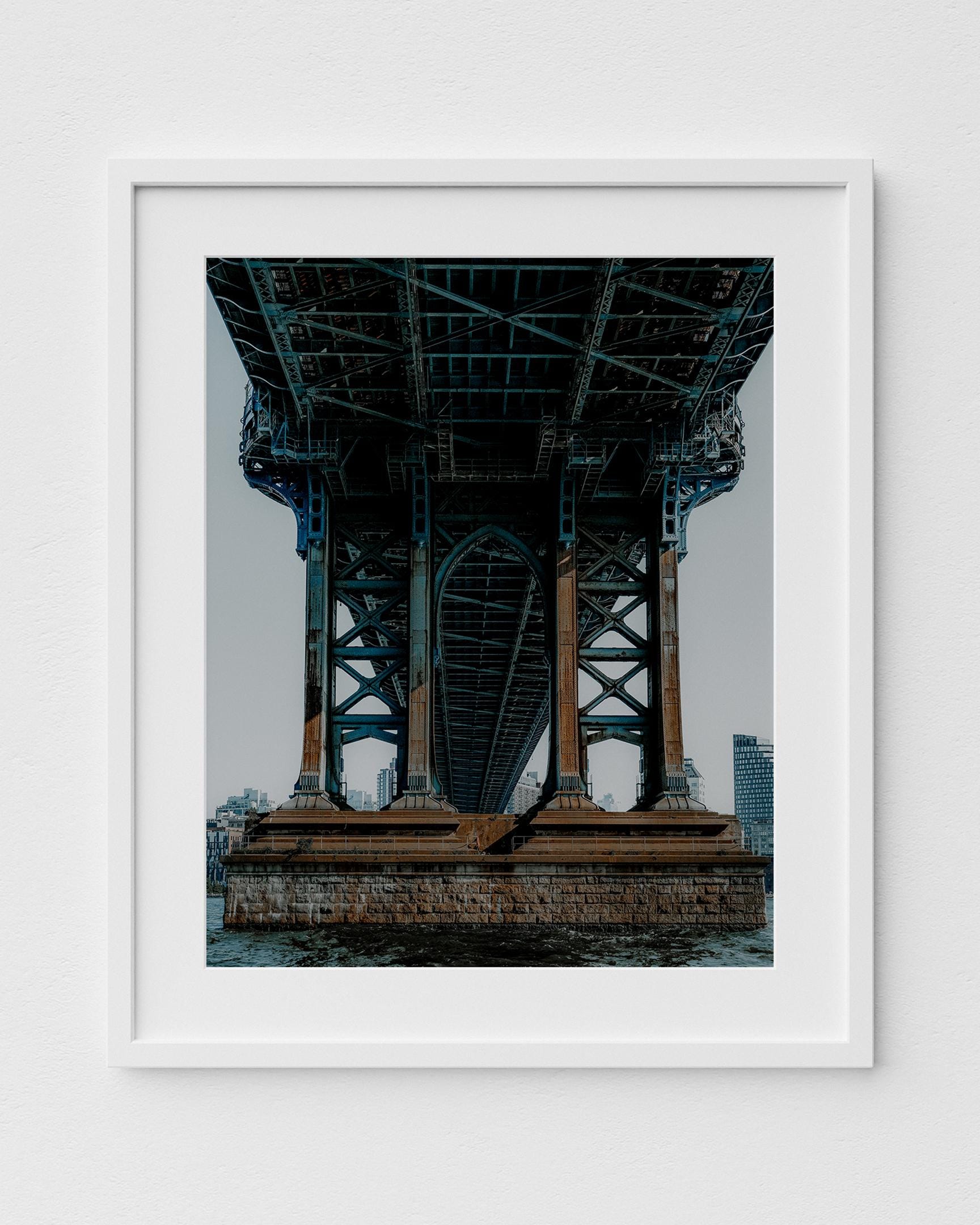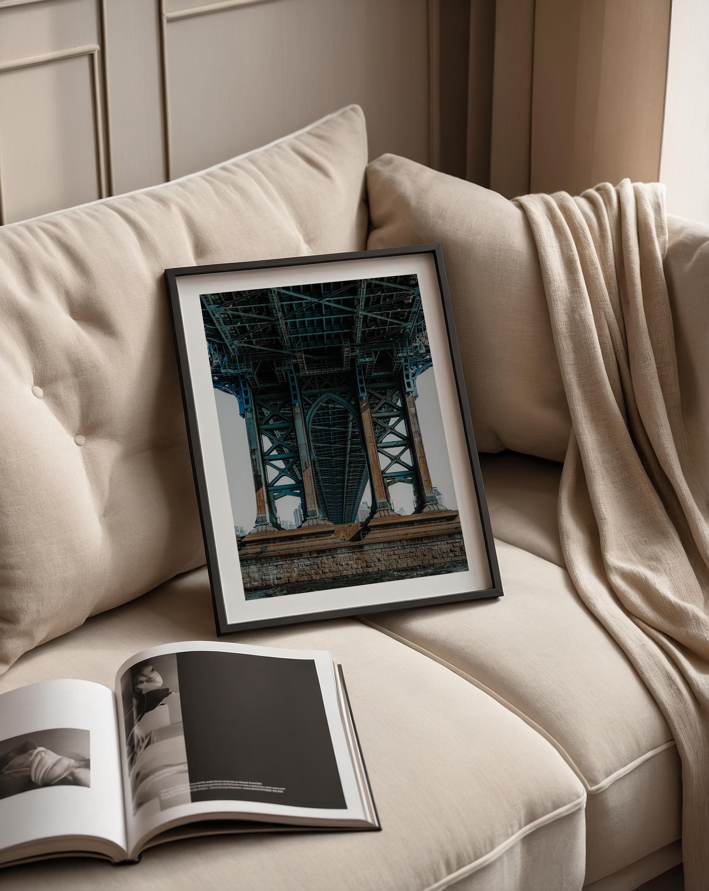 Transform your space with iconic New York architecture. Discover the raw, cinematic beauty of New York in this fine-art photograph of the Manhattan Bridge from a dramatic underpass perspective. The rich teal steel, rust accents, and bold urban geometry create a striking visual statement.