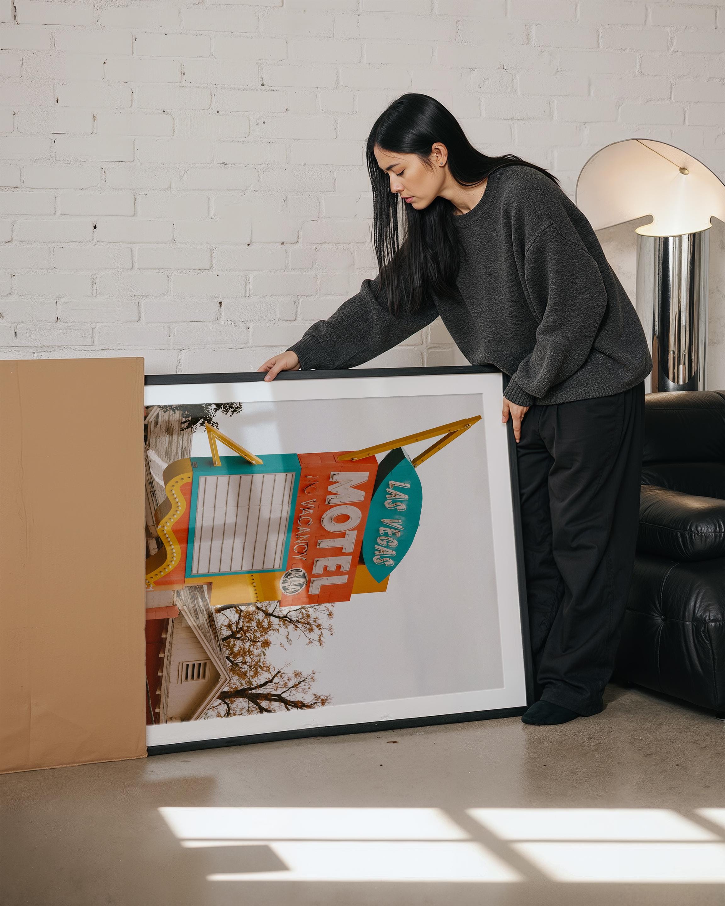 Add a bold touch of retro Las Vegas to your space with this framed giclée wall print featuring a classic motel sign in vibrant color. The neon details, vintage lettering, and clean cinematic styling make this piece an eye-catching accent for any modern room. It brings personality and character without overwhelming your décor — a statement piece that feels timeless and stylish.