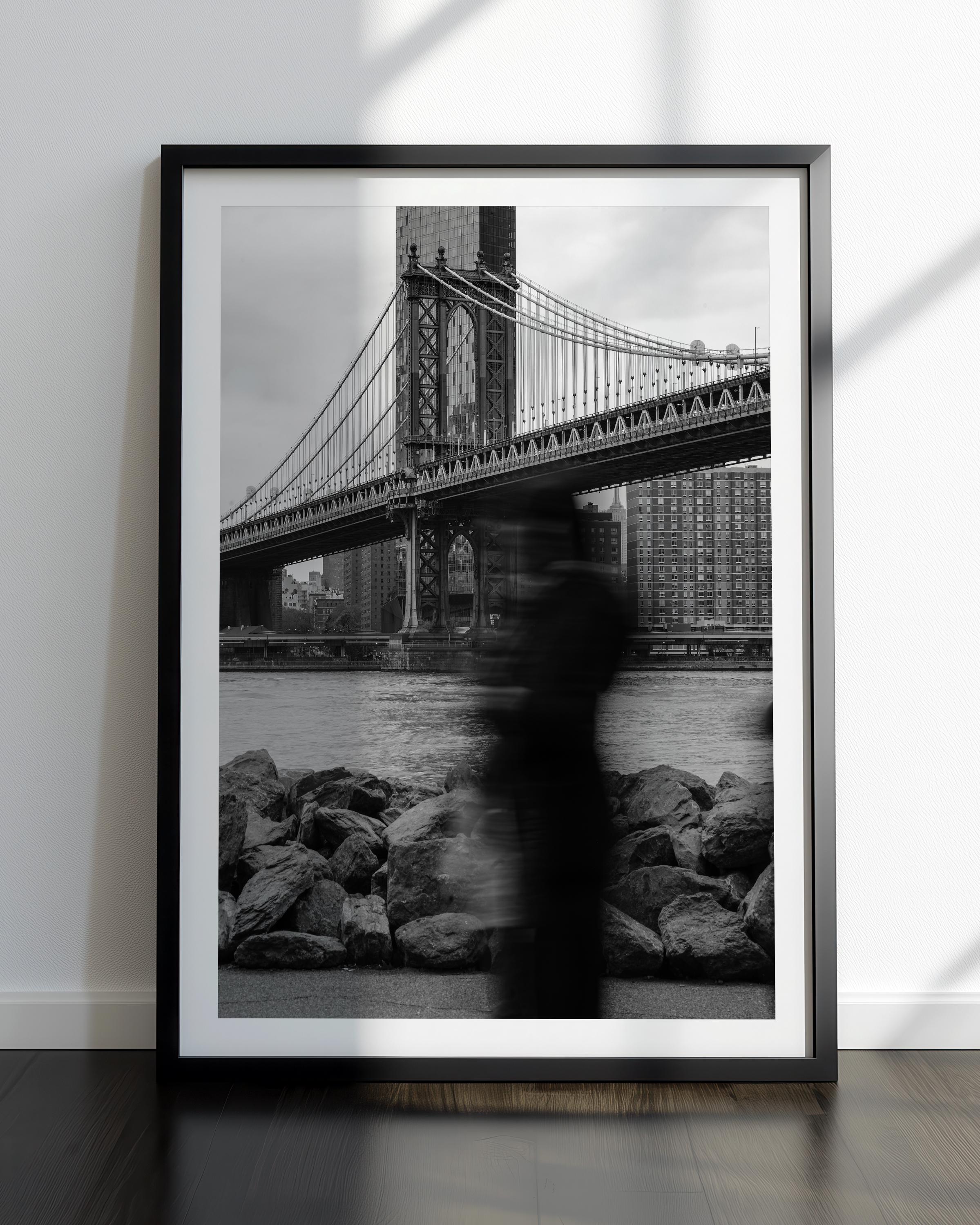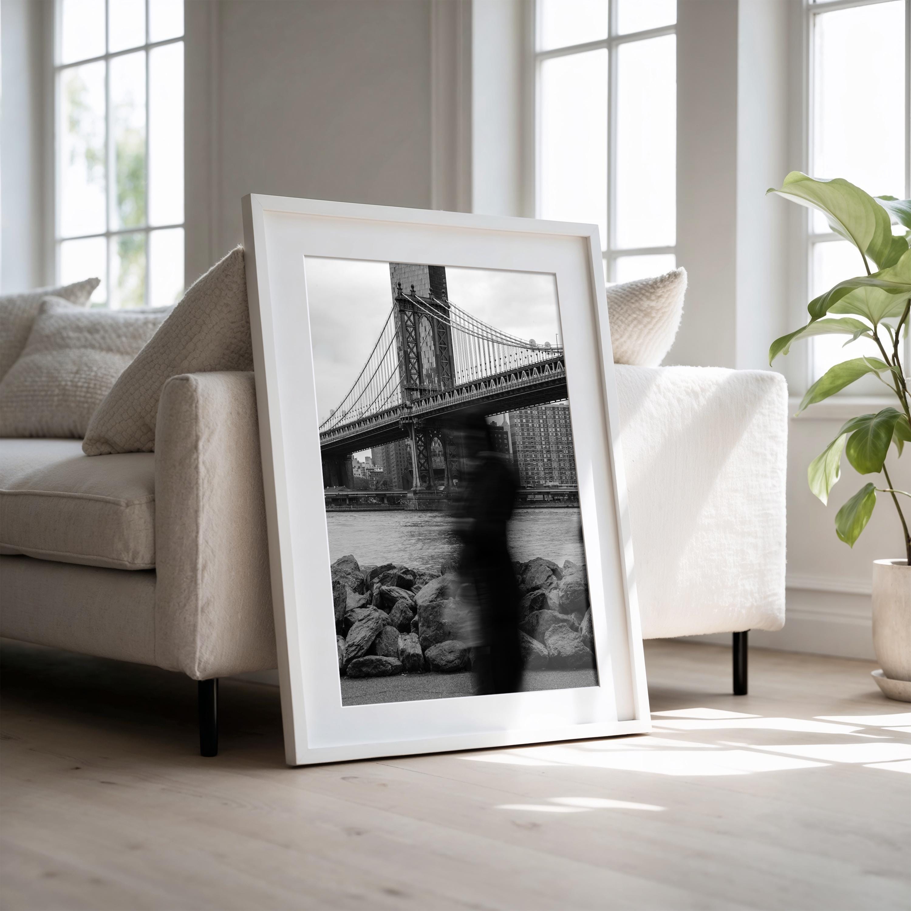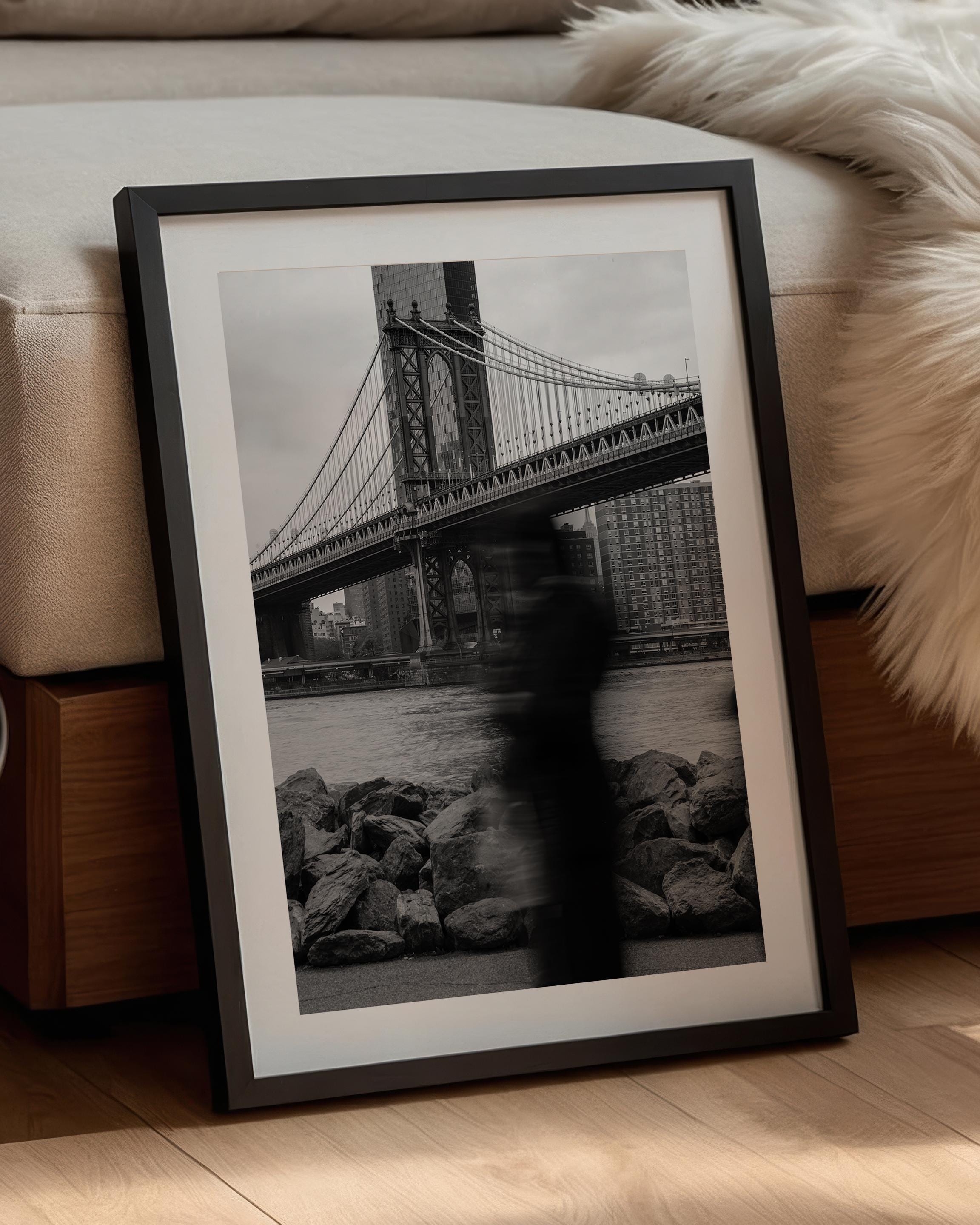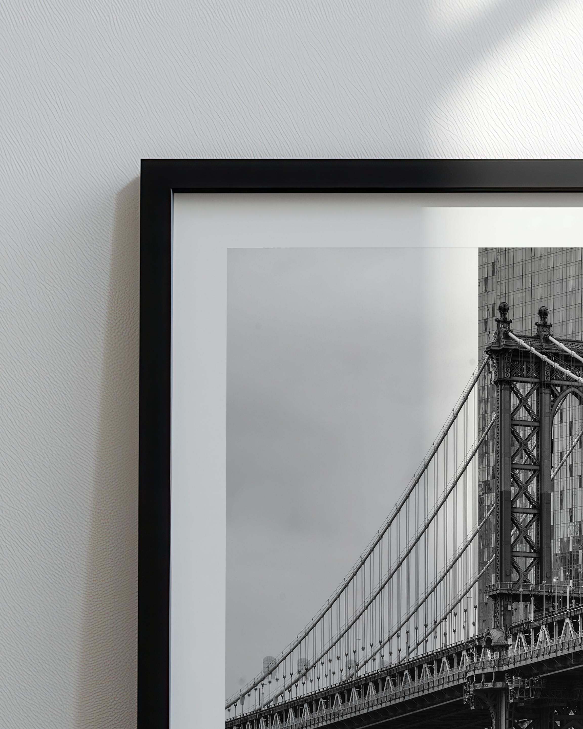 A framed fine art print of the Manhattan Bridge in black and white. This urban wall print captures a classic New York City scene and adds a clean, timeless element to any space.