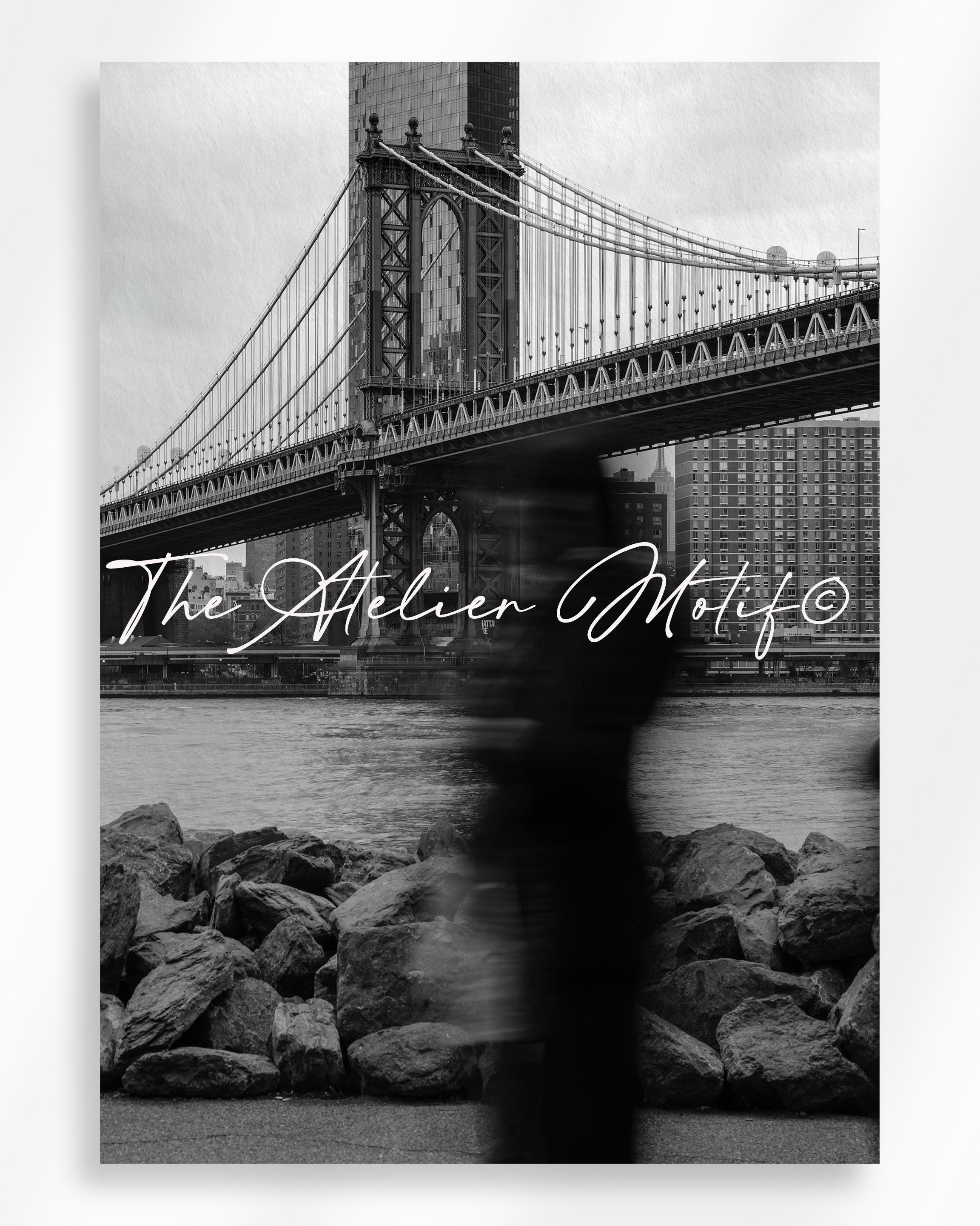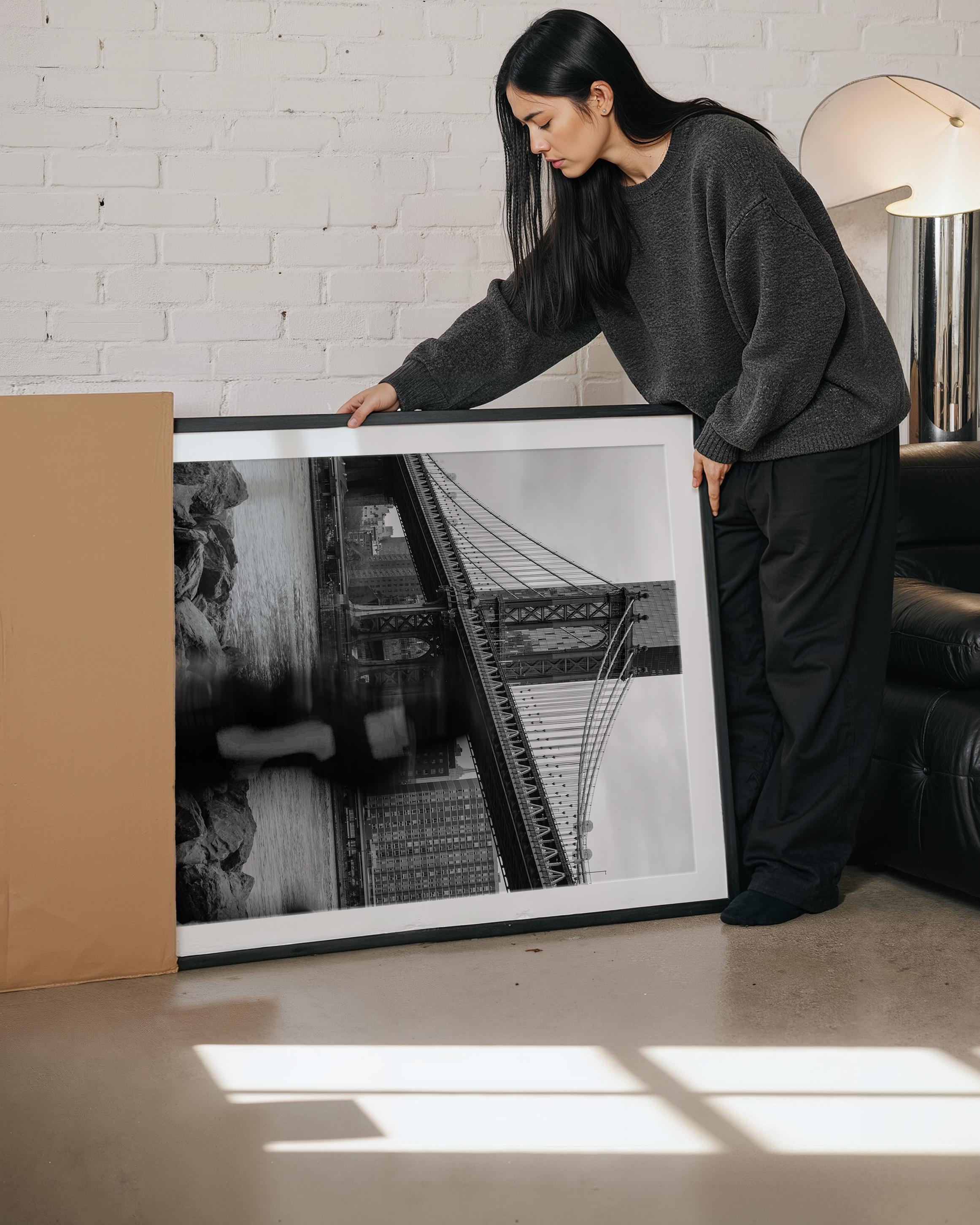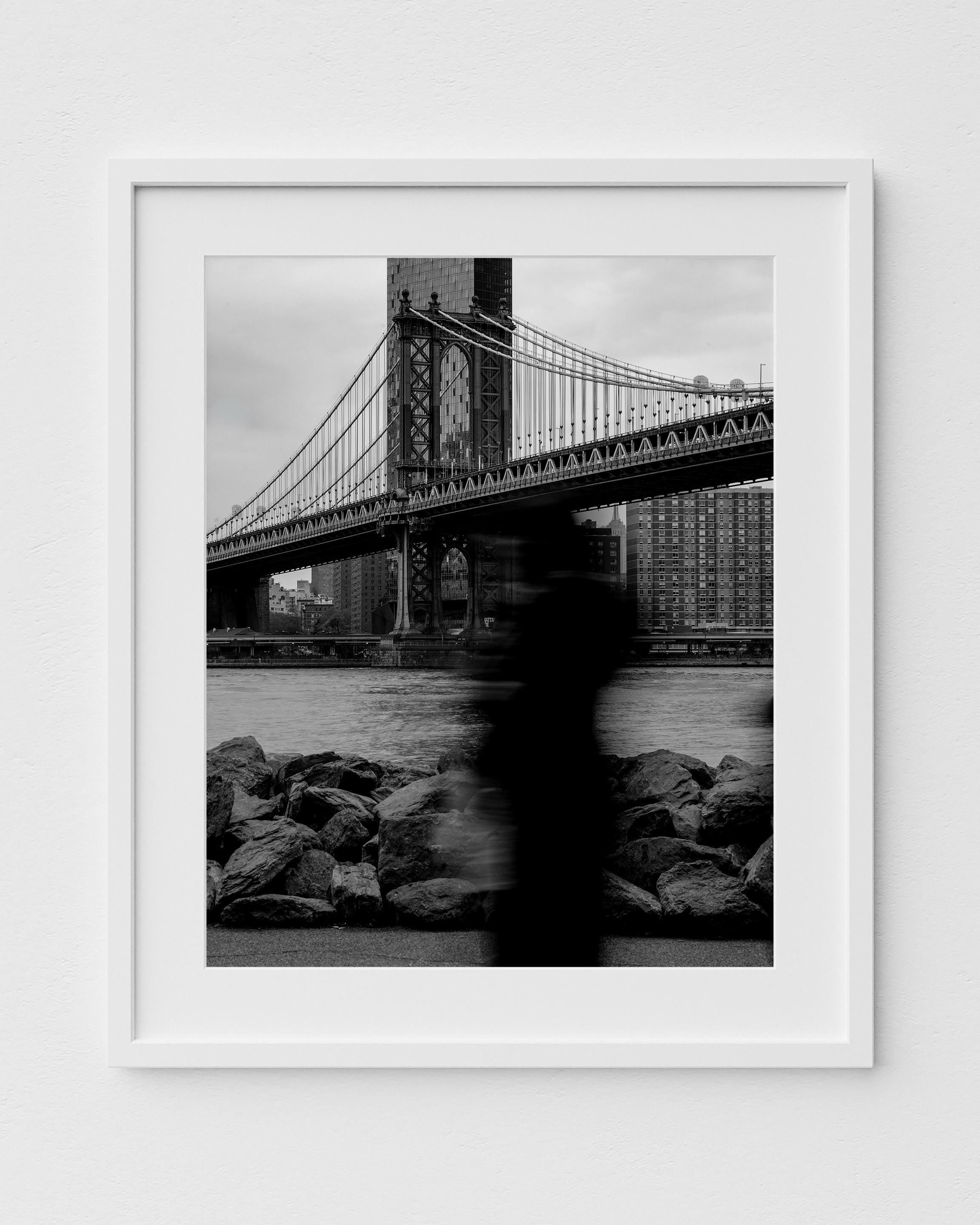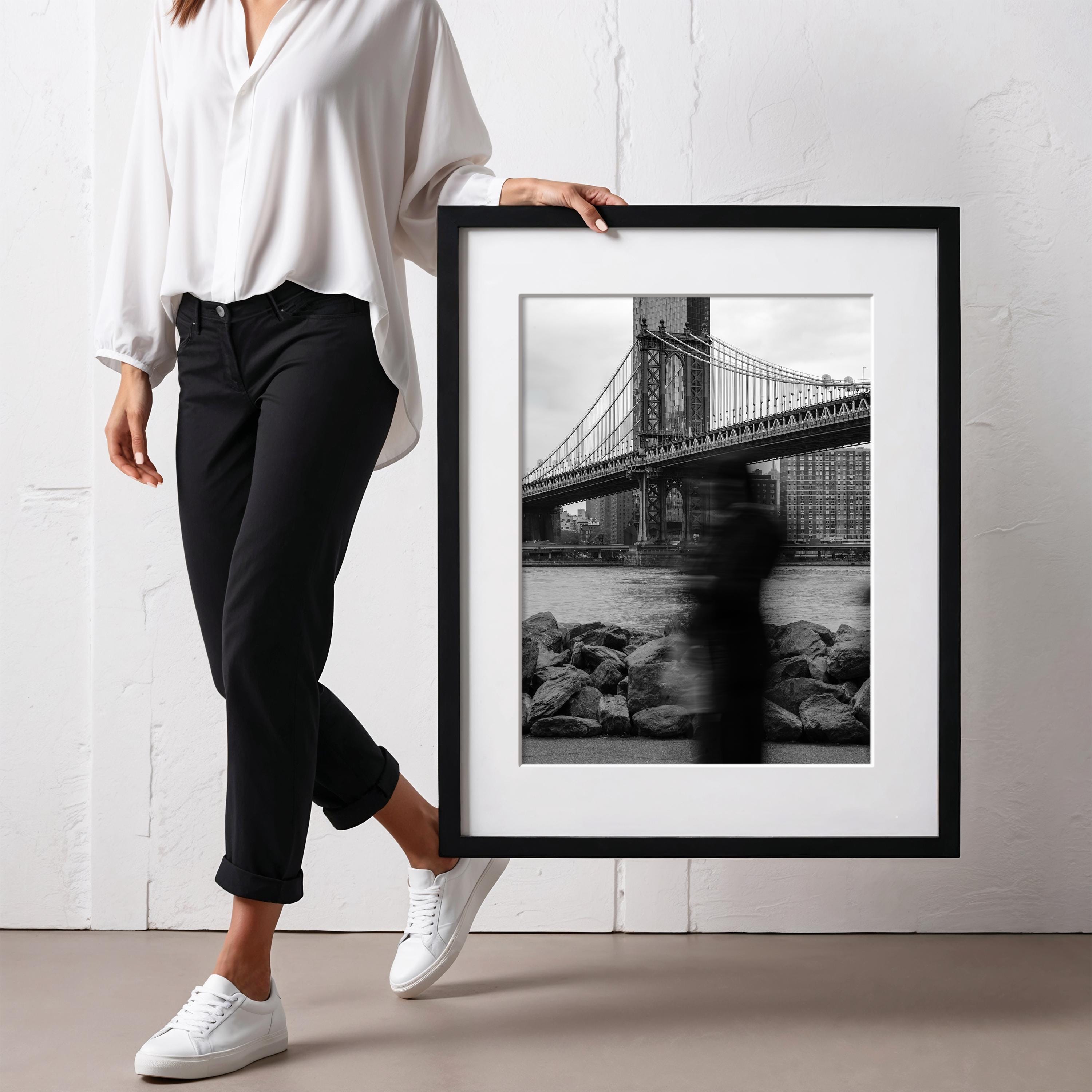 A framed fine art print of the Manhattan Bridge in black and white. This urban wall print captures a classic New York City scene and adds a clean, timeless element to any space.