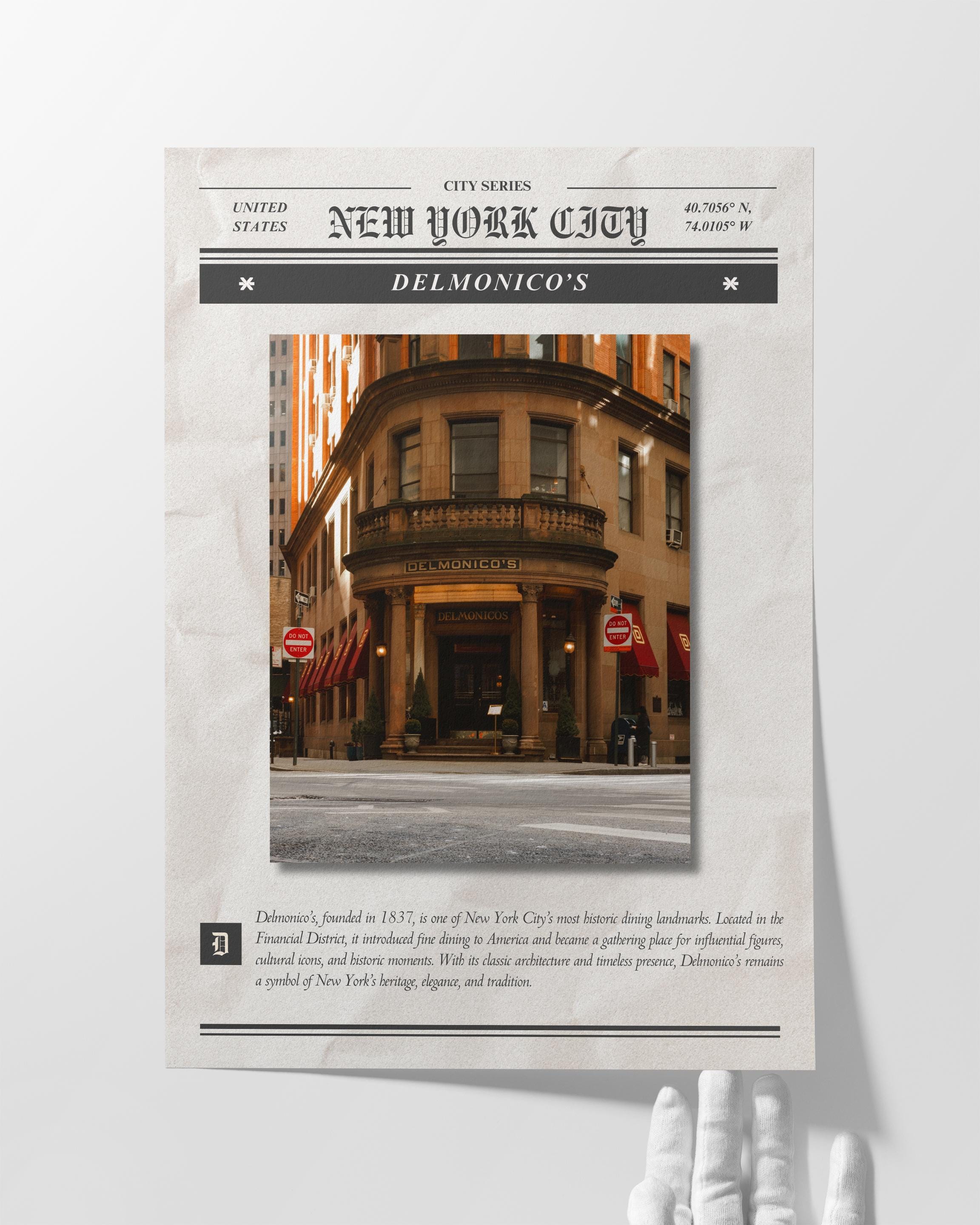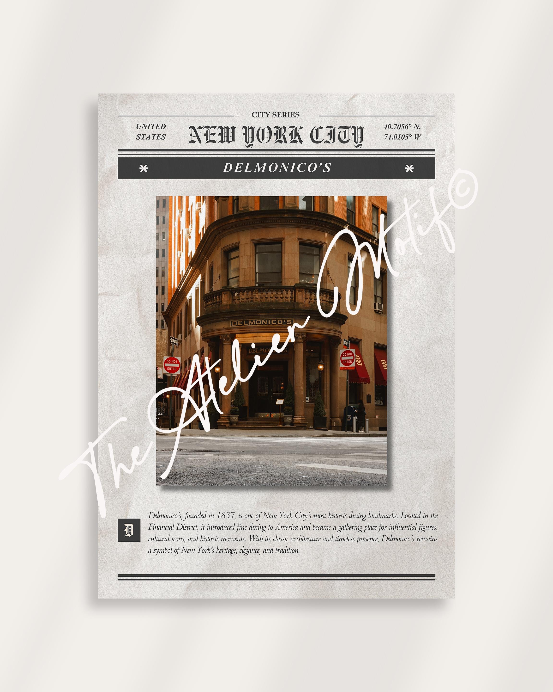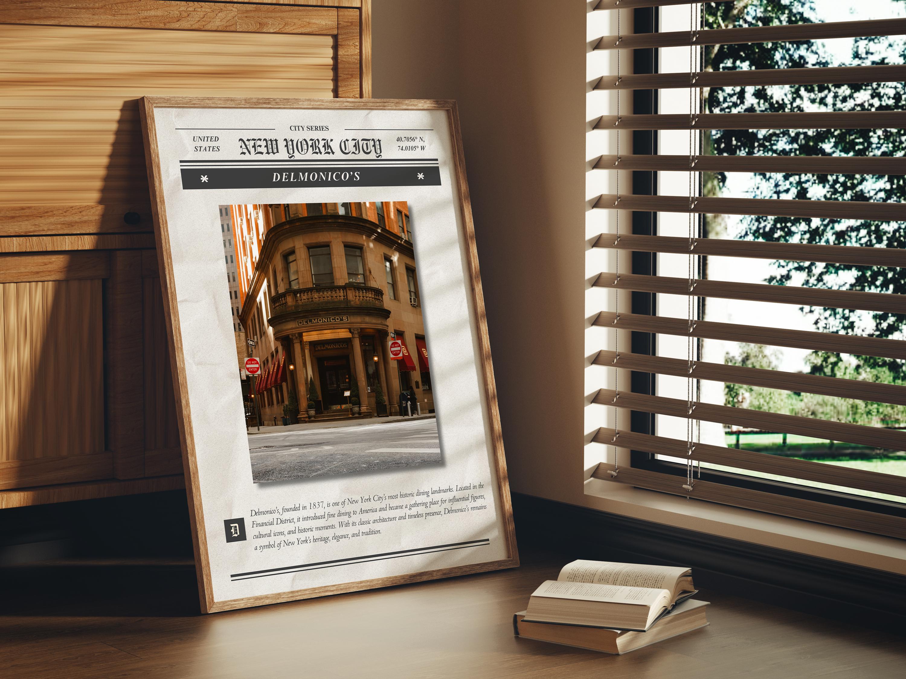 Bring a piece of New York City history into your space with this restaurant poster inspired by Delmonico’s NYC. Designed in the style of a vintage newspaper print, this NYC vintage poster captures the spirit of classic dining while highlighting architectural details from one of the city’s most legendary spots. If you love old newspaper art and retro NYC decor, this historic NYC print makes a great addition to your home or office. This classic cafe poster combines the essence of vintage restaurant culture with NYC newspaper art for a distinctive look.