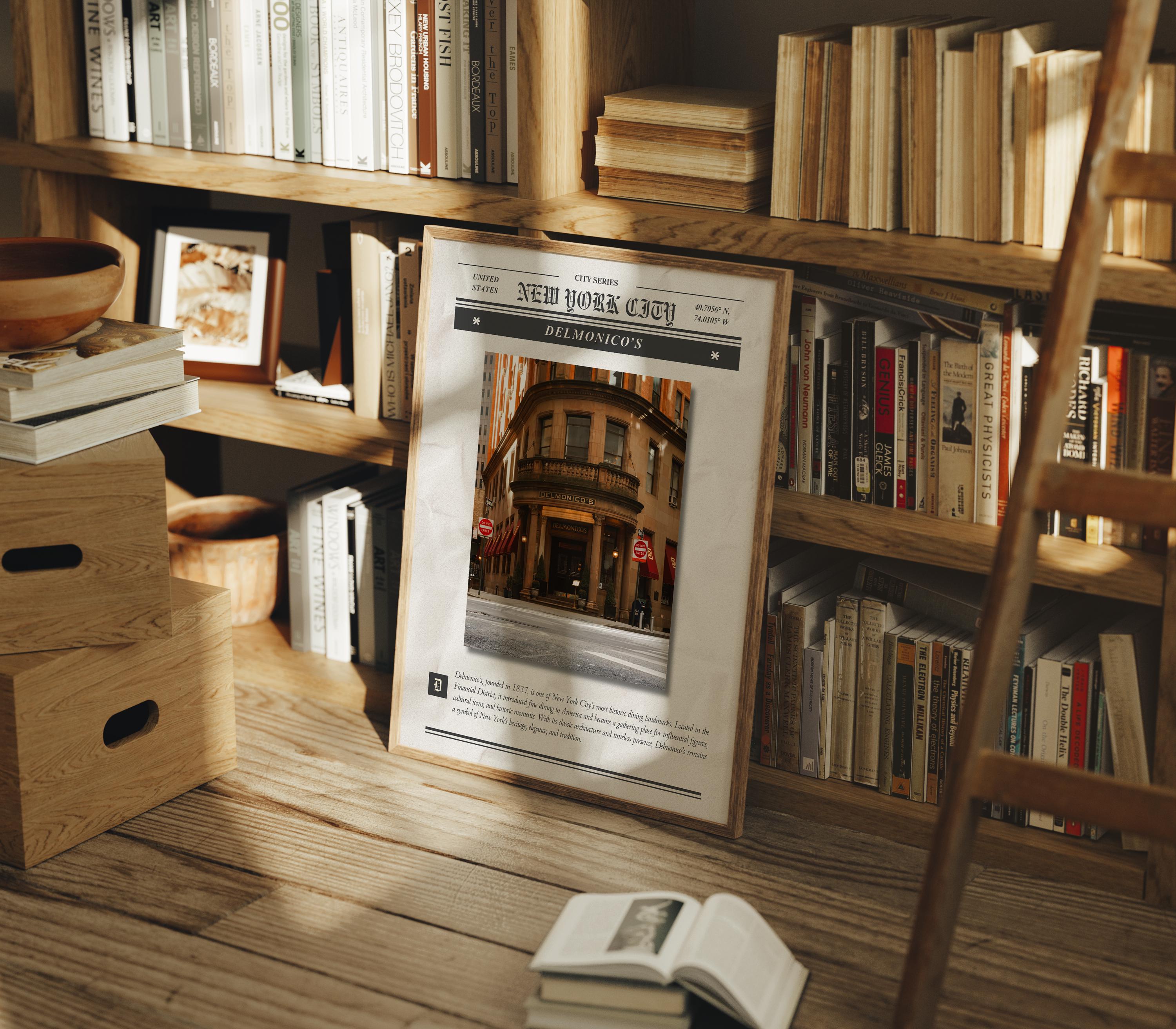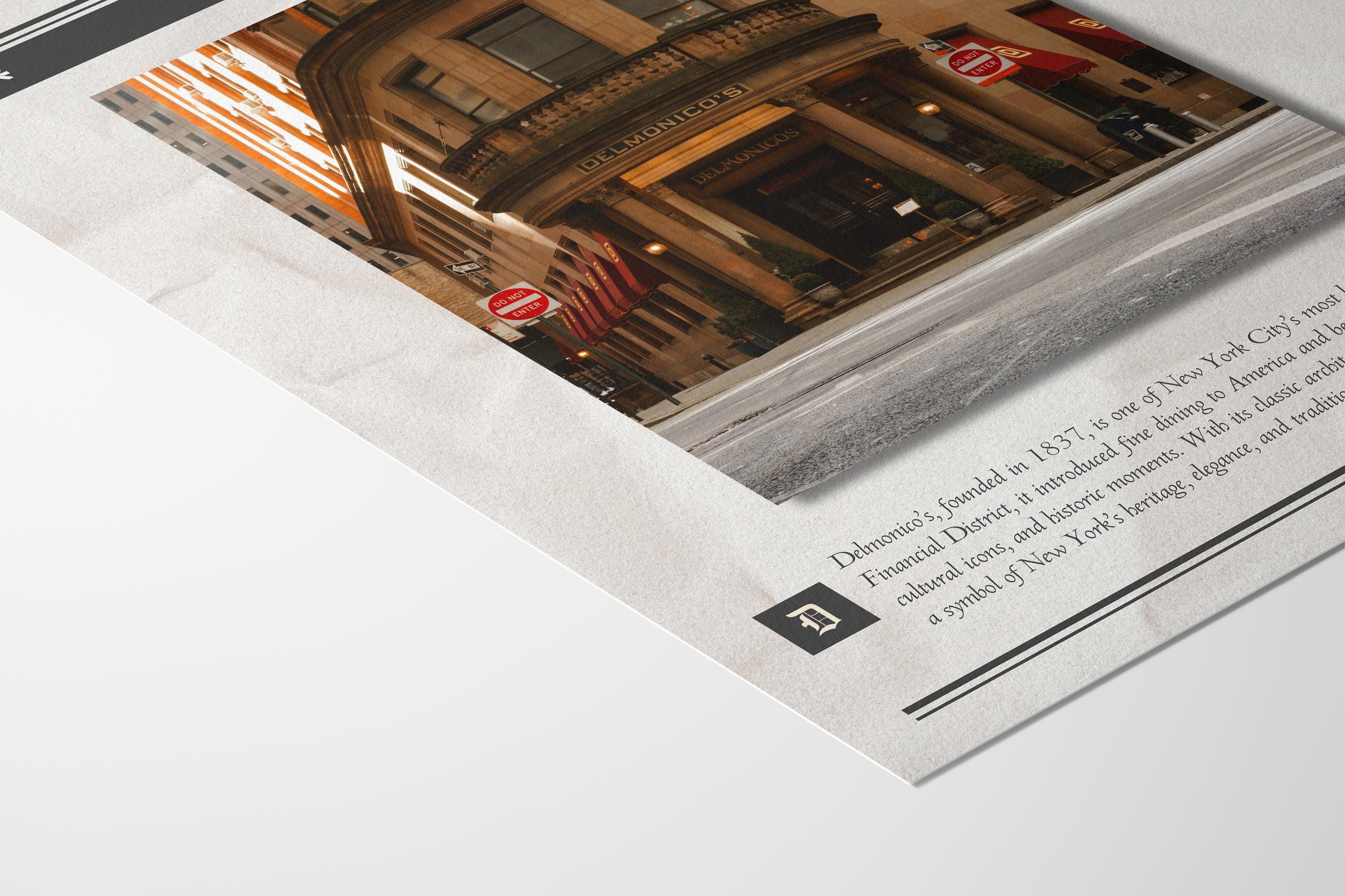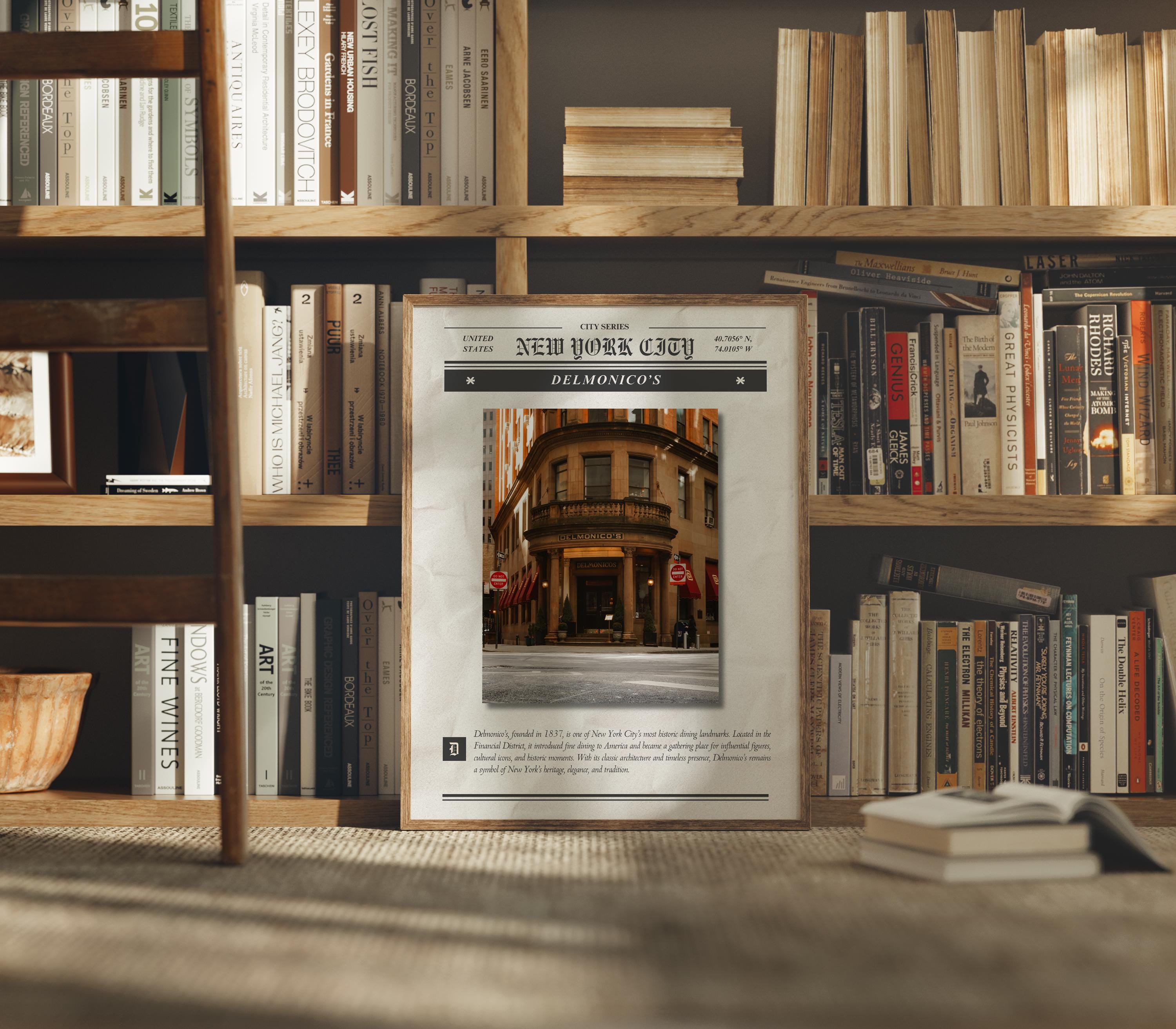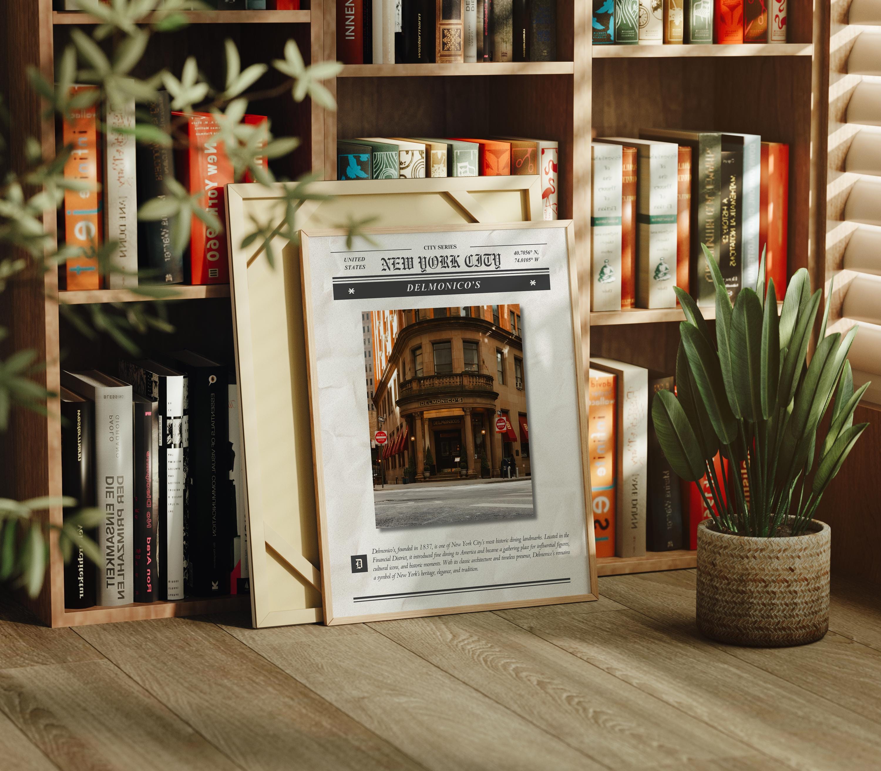 Bring a piece of New York City history into your space with this restaurant poster inspired by Delmonico’s NYC. Designed in the style of a vintage newspaper print, this NYC vintage poster captures the spirit of classic dining while highlighting architectural details from one of the city’s most legendary spots. If you love old newspaper art and retro NYC decor, this historic NYC print makes a great addition to your home or office. This classic cafe poster combines the essence of vintage restaurant culture with NYC newspaper art for a distinctive look.