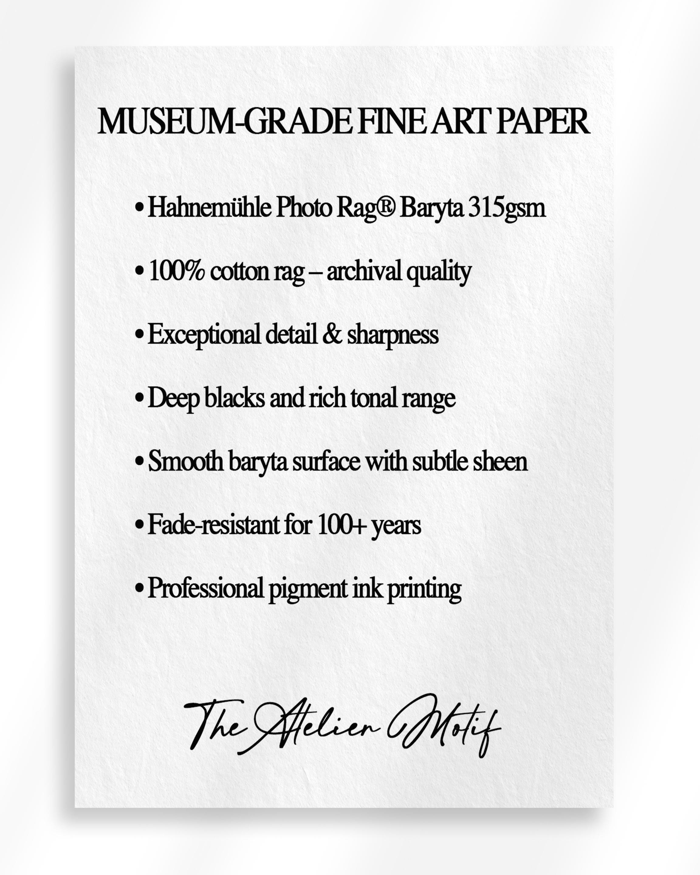 Printed on premium Hahnemühle Photo Rag® Baryta paper, a 315gsm museum-grade fine art paper made from 100% cotton, this piece offers exceptional quality, texture, and durability. The high-quality materials ensure that your wall art remains a stunning centerpiece for years to come.